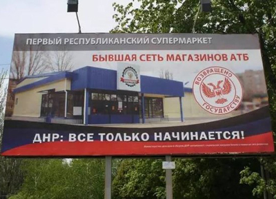В социальных сетях появились фотографии билбордов в Донецке, на которых изображено, что именно возвращено "государству". Среди "национализированных" объектов и сеть магазинов "АТБ".