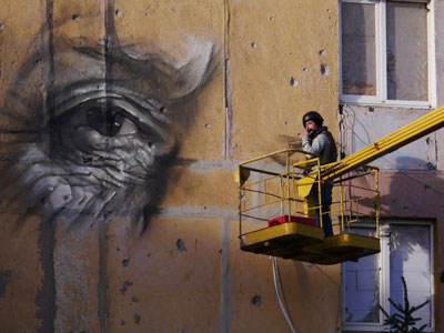 Дом, на фасаде которого австралийский художник Гвидо Ван Хелтен создал мурал, с 2014 года стоит пустым, после того, как попавшая в него ракета "Град", убила двух жителей.Прототипом образа...