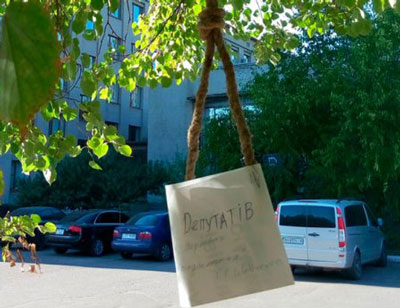 У здания Славянского городского совета неизвестные оставили послание в виде виселицы.К веревке была прицеплена записка, в которой упомянуты слова из произведения Тараса Шевченко. "Депутатов живых, мертвых и нерожденных", — говорится...