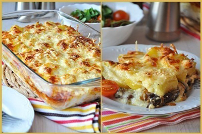 Ингредиенты:Грибы замороженные(лесные, или вешенки) - 500-700 гр.,Картофель отварной в мундире - 6 шт.,Сыр Моцарелла - 200 гр.,Твёрдый сыр(пармезан, "джугас") - 150 гр.,Лук репчатый - 2 шт.,
