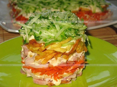 Ингредиенты:- курица копченая- картофель- огурец свежий- морковка корейская- лук репчатый- уксус- майонезПриготовление:1. Подсолнечное масло Картофель нарезать очень тонкой соломкой, обжарить в...