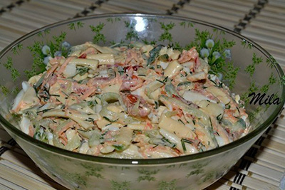 Ингредиенты:●3 вареных яйца●250 гр. свежего огурца●250 гр. болгарского перца●100 гр. моркови●150 гр. сыра●зелень●майонез●соль, перецПриготовление:Огурцы и перец по отдельности натереть на...