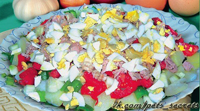 Ингредиенты250 г консервированного в масле тунца3 сваренных в мундире клубня картофеля1 стручок сладкого перца2–3 помидора3 сваренных вкрутую яйца40 мл оливкового масласольСпособ приготовления
