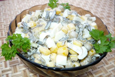 ИнгредиентыМорская капуста - 200 г.Зеленый горошек консервированный - 200 г.Кукуруза консервированная - 200 г.Яйца - 3 шт.Лук репчатый - 1 шт.Майонез - 200 г.Соль...
