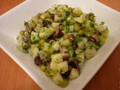 ИнгредиентыКартофель - 2-3 шт.Зеленый горошек - 1 банка.Маринованные огурцы - 2 шт.Грибы соленые или маринованные - 250-300 г.Укроп - по вкусу.Растительное масло - 2-3...