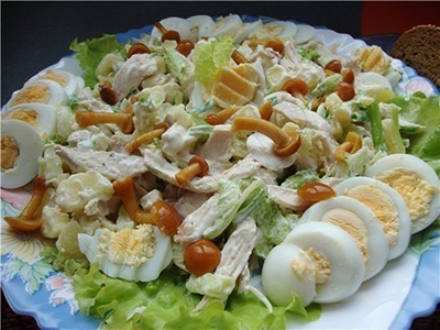 Ингредиенты:6 шт - отварной картофель1 шт - лук репчатый400 гр - мясо отварное5 шт - вареные яйца200 гр - грибы маринованныезелень по вкусу, майонез