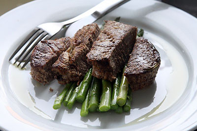 Ингредиенты:Свежая говядина (филе, вырезка) — 250 гЛайм — ½ шт.Чеснок — 2 зубчикаРозмарин — 2 веточкиТимьян — 2 веточкиМолодая спаржа — охапкаМолотый черный...