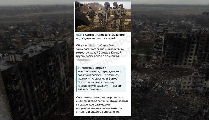 Російська пропаганда поширює заяви окупантів про те, що ЗСУ в Костянтинівці нібито «ховаються під виглядом мирних жителів», накидаючи цивільний одяг поверх форми, та займають верхні поверхи житлових будинків.