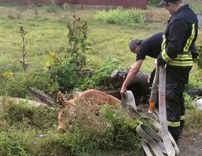 Днями до Служби порятунку по допомогу звернулися небайдужі мешканці Краматорська, які повідомили, що у яму глибиною 1,5 м впало теля. Тварина самостійно вибратися не могла.