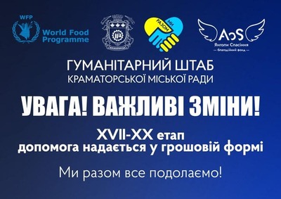 Майбутні чотири етапи надання гуманітарної допомоги у Краматорській громаді, а саме XVII, XVIII, XIX та XX будуть реалізовуватись шляхом надання фінансової допомоги замість продуктових наборів.