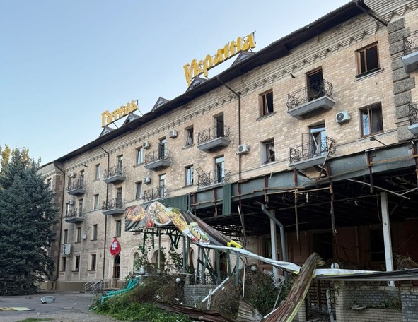Перше влучання по вулиці Шевченка, у літній майданчик ресторану готелю...