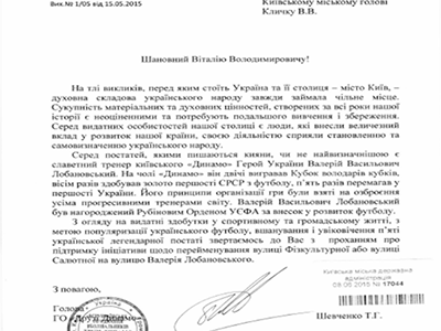 Болельщики обратились к мэру Киева Виталию КличкоБолельщики киевского «Динамо» обратились к мэру столицы Виталию Кличко с просьбой переименовать одну из улиц города в честь легендарного тренера Валерия Лобановского.