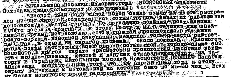 Жительница посёлка Меловая гора ВООКОВСКАЯ Анастасия Петровна свидетельствует о следующем: «Весной 1942 года талой водой омыло землю на месте расстрелов мирных жителей, обнаружились сотни трупов, запах их разложения доносился до центра города. По приказанию полиции всех женщин нашего посёлка пригнали...