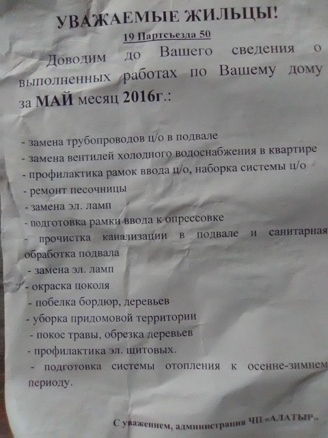 Сегодня 31.05.16 на нашем подъезде появился отчет о проделанной работе ЧП "Алатыр", это конечно шаг вперед. Но вот написанное, иногда порождает удивление: во-первых замена электролам написана 2 раза, но ни разу никто даже не предлагал! Второе: окраска цоколя, на фото...