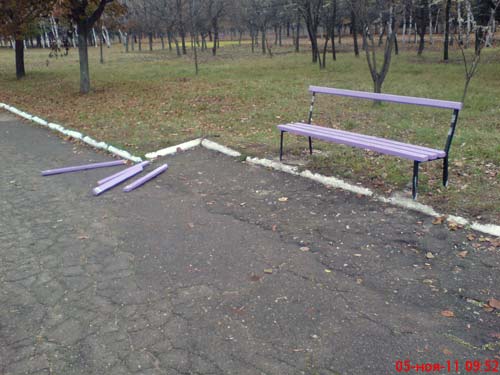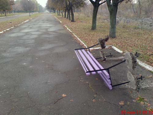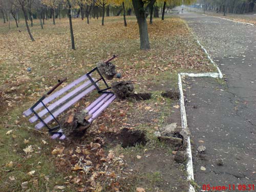 - Это происшествие возмущает своей бессмысленностью. Кто и с какой целью выворотил вместе с бетоном пять скамеек, не известно, - говорит директор коммунального предприятия «Объединение парков культуры и отдыха» Виктор Маринин. - Мы сразу же обратились в милицию и написали заявление. Ущерб от действий вандалов составил 4764 гривны.