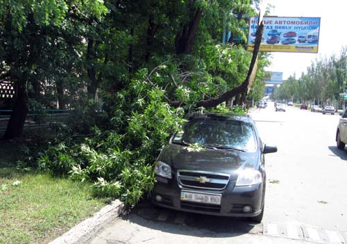 Очередное происшествие, связанное с падающими деревьями, случилось около полудня 4 июня на ул. Дворцовой. Часть дерева упала на «Шевроле Авео», когда тот проезжал мимо 22-й школы. По-видимому, всему виной – вчерашний сильный ветер. Кстати, как видно на одном из фото там еще есть чему упасть.