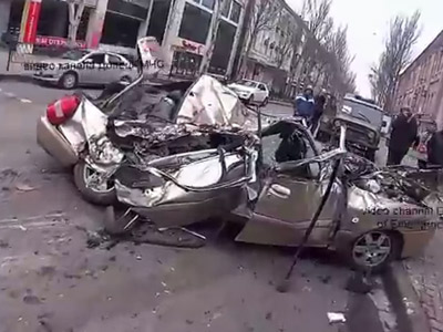 Сегодня утром в Донецке на улице Артема, в районе торгово-развлекательного центра "Грин-плаза", промчались пять бронированных машин. Одна из них въехала в легковой автомобиль.