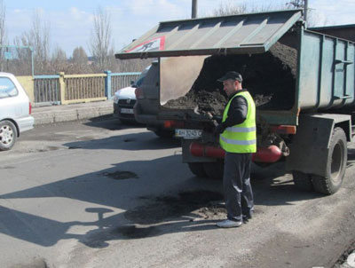 В Славянске продолжают бороться с многочисленными ямами на дорогах "подручными" материалами.На мостах, расположенных на въезде в город, образовавшиеся после зимы ямы засыпают материалом черного цвета. Утрамбовкой их самостоятельно...