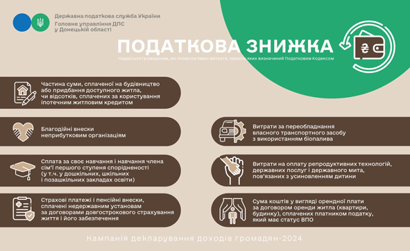 Головне управління ДПС у Донецькій області інформує, що починаючи з 01 січня 2024 року фізичні особи мають можливість отримати податкову знижку за витратами, здійсненими у 2023 році.