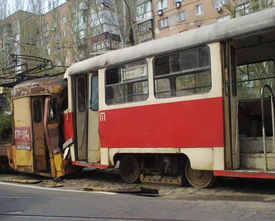 Вчера в Донецке произошла авария с трамваями — пассажирский и технический вагоны врезались друг в друга. Два человека, находившиеся во врезавшемся трамвае, были госпитализированы с переломами ног.
