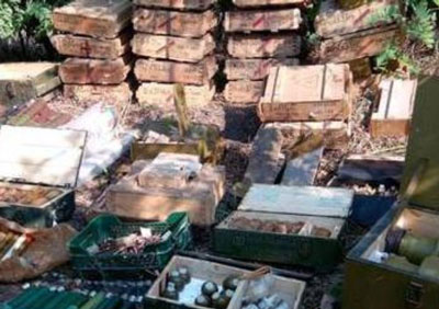 "В лесном массиве, неподалеку автотрассы "Артемовск-Лисичанск", обнаружен тайник с двумя противотанковыми управляемыми ракетами, сорок реактивных противотанковых гранат различной модификации, почти сотня ручных гранат, 15 тыс. патронов различного калибра, гранатометные...