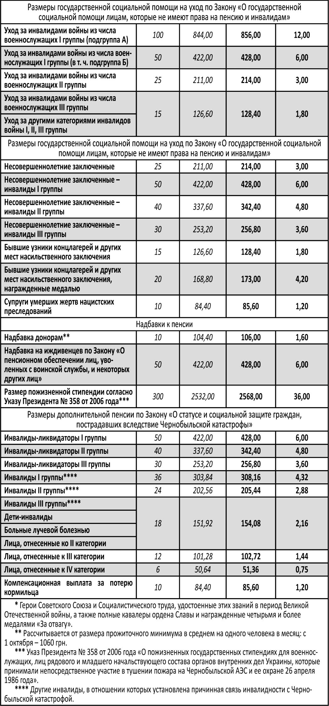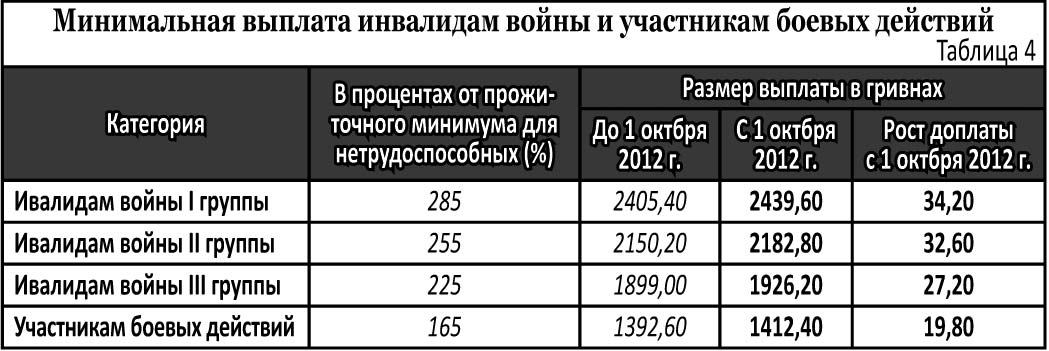 Для инвалидов войны и участников боевых действий с 1-го октября устанавливается новый минимальный размер пенсионной выплаты (см. таблицу 4). Отметим, что увеличение размеров пенсий названных категорий лиц осуществляется без учета предусмотренных законодательством надбавок, повышений, дополнительной пенсии, целевой денежной помощи, пенсии за особые заслуги перед Украиной, сумм индексации и других доплат к пенсии.