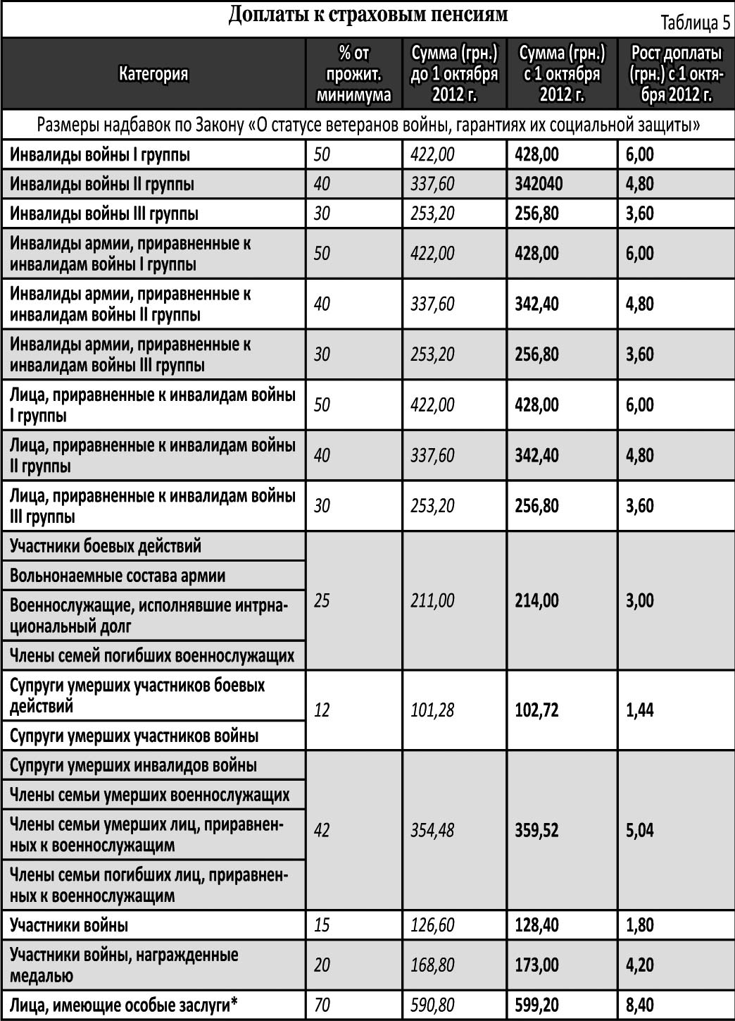 Обращаем ваше внимание на то, что пенсия выросла на разницу между суммой, выплачиваемой до 1-го октября 2012 года и, соответственно, с 1-го октября. Например, участники войны с 1-го июля текущего года получали доплату к страховым пенсиям 126,60 грн. А с 1-го октября надбавка составит 128,40 грн. Значит, к пенсии добавится 1,80 грн. (128,40-126,60). Аналогичный расчет производится и для других категорий пенсионеров.