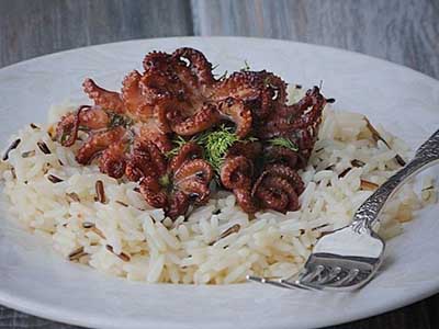 Ингредиенты:Осьминожки — 400 гЧеснок — 4 зубчикаСухое красное вино — 150 млСоевый соус — 3 ст. л.Оливковое масло — 50 млСоль, перец по вкусу