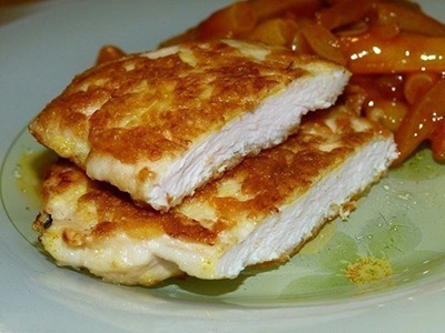 Ингредиенты:— 250 г филе куриной грудки— 1 ст.л. майонеза— 1 яйцо— 1 ст.л. пшеничной муки— растительное масло— гранулированный чеснок— соль— специиПриготовление: