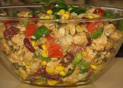 Ингредиенты:- 2 куриных филе- 1 банка консервированной кукурузы- 1 банка консервированной красной фасоли- средний зеленый перец- 2 средних помидора- 1 средняя луковица- петрушка-...