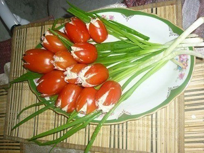 Ингредиенты:помидорысыр2 яйцачеснокгрецкий орехмайонезПриготовление:1. Делаем тюльпанчик нарезаем лепестки в верхней части помидора, лучше если помидоры будут потверже.2. Убираем, то что мы надрезали....