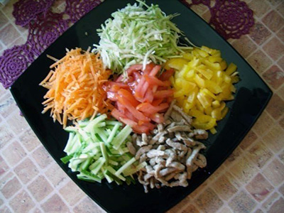 300гр. болгарского перца300гр. огурцов250гр. моркови200гр. филе свинины200гр. капустыМайонез для заправкиСоль, перец2 помидораМасло растительноеПриготовление:Нарезаем мясо на маленькие кубики, обжариваем его на...