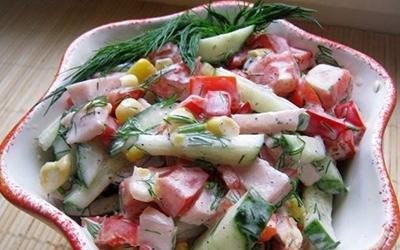 Ингредиенты:Копченый окорочок (снять шкурку и убрать кости)1 огурец (снять шкурку)1 помидор1 сладкий перец2-3 ст.л. кукурузы консервированной1 ст.л. майонезаСоль, перец — по вкусуУкроп