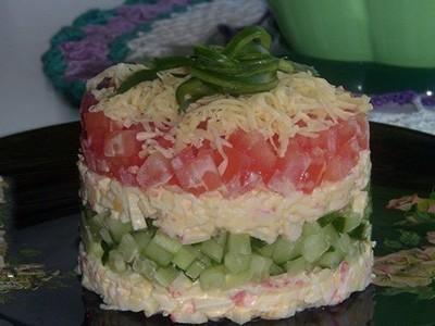 Ингредиенты:Крабовые палочки-100 гр.Яйцо вареное-1 шт.Свежый огурец,Помидор,Сыр-30 гр.Майонез-2 стол.ложки.Приготовление:1.Палочки+яйцо+майонез.2.Укладываем слоями:палочки,огурец,палочки,помидор,сыр.Украшаем
