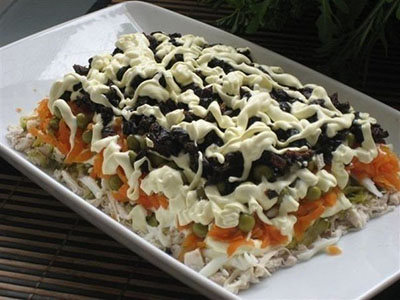 Ингредиенты:●3 филе курицы,●300 гр твердого сыра,●6 яиц,●стакан сладкого чернослива без косточек,●1 зубчик чеснока,●300 гр готовой пряной морковки по-корейски,●полстакана немного толченых грецких орехов,●500...