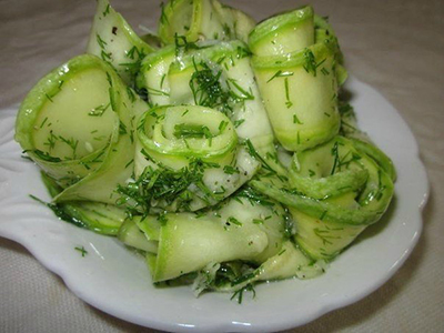 400-500гр. молодых кабачков2-3 зубчика чеснока1 столовая ложка акациевого жидкого меда2 ст. ложки белого винного уксуса60-70гр. растительного маслапучок укропасоль, перецСпособ приготовления:1. Моем и...