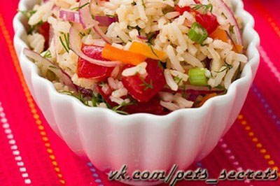 50 г риса,1 красный и 1зелёный сладкий перец, 1 помидор, 1 маринованный огурец, 1 луковица.