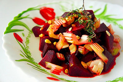 Время приготовления: 25 минутИнгредиенты:Свёкла — 3 шт.Соус соевый — 100 млУксус бальзамический — 30 млСельдерей — 150 гКедровые орехи — 40...