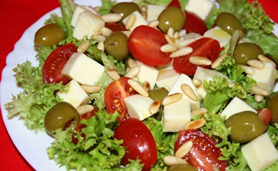 ИнгредиентыСыр моцарелла — 150 гПомидоры черри — 150 гЛистья зеленого салата — 30 гЗеленые оливки без косточки — 70 гКедровые орехи — 50 гОливковое...