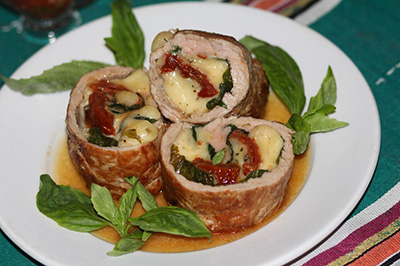 Ингредиенты:Свиная вырезка — 1 шт. (490 г)Вяленые томаты — 100 гМоцарелла — 120 гБазилик (листья) — 20 гВино белое сухое — 50 млЛимонный сок...