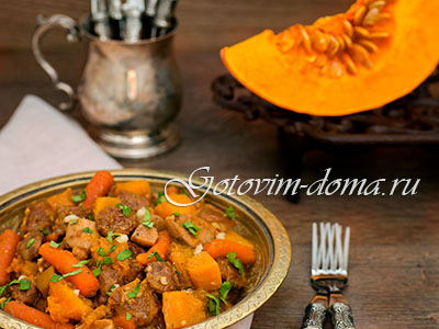 СоставПорции: 4-6говядина (лопатка, тазобедренная часть) - 800 г,тыква очищенная - 400 г,белые грибы (замороженные) - 300 г,светлое нефильтрованное пиво - 500 мл,бекон (по желанию)...