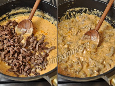 Составговядина (вырезка или длиннейшая мышца спины) - 400 г,лук репчатый - 2 шт,сметана - 150-200 г,сливочное масло - 50 г,растительное масло - 3 столовых ложки,