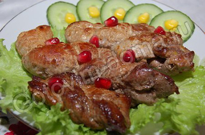 Составсвинина - 500 г,лук репчатый - 1-2 шт,сок 0,5 лимона,соль,перец,растительное масло,зелень,зерна гранатаПриготовлениеСвинину вымыть, обсушить, отбить с двух сторон...
