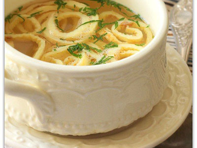 Ингредиенты (на один омлет и 2 средние порции бульона):Яйца куриные — 1 шт.Молоко — 1 ст. л.Крахмал — 1 ч. л.Соль — по вкусуПриготовление: