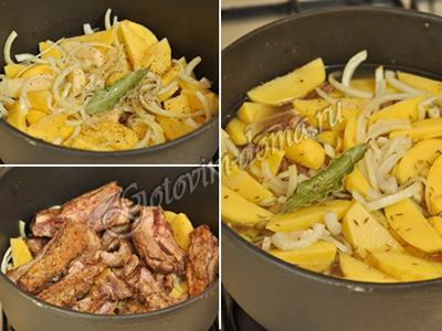 Составна 6 порцийбаранья грудинка - 1 кг,картофель - 1,5 кг,лук репчатый - 2 шт,мука - 1-2 столовых ложки,лавровый лист - 2 шт,горошины душистого...