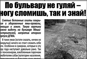 «Администрацией города неоднократно рассматривалась необходимость реконструкции бульвара Машиностроителей. В связи с тем, что 70% покрытия бетонной плитки пришли в негодность и требуют замены, капитального ремонта требуют зеленные насаждения, установки декоративных светильников и установки малых архитектурных форм. Все эти работы требуют значительных финансовых вложений из местного бюджета. Программой благоустройства города на 2008-2011 годы, утвержденной решением городского совета от 14.11.2007, данные работы не предусмотрены. Согласно указанной Программе, выполнены работы по реконструкции сквера им. Шевченко и сквера по бульвару Краматорскому. При формировании Программы благоустройства на 2012-2015 годы будут предусмотрены работы по реконструкции бульвара Машиностроителей с разработкой проектно-сметной документации. Начальник Управления Владимир Фальченко». Лиля ВАСИЛЬЕВА |