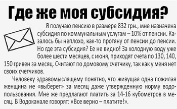 *«В вашей газете от 15.12.2010 года в выпуске № 50 было опубликовано письмо жительницы города Краматорска, которое затрагивало вопросы начислений за оказанные услуги по водоснабжению и водоотведению по показаниям домовых приборов учета и начислению субсидии.