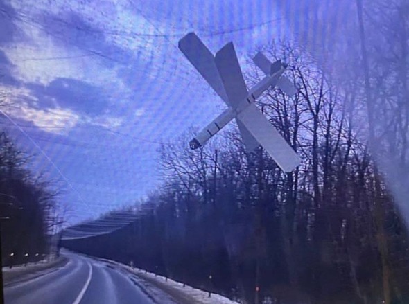 Фото російського безпілотника "Ланцет", що цілився у автівки на Слов'янському напрямку, втім застряг в антидроновій сітці, опублікував у Facebook 11-й армійський корпус.