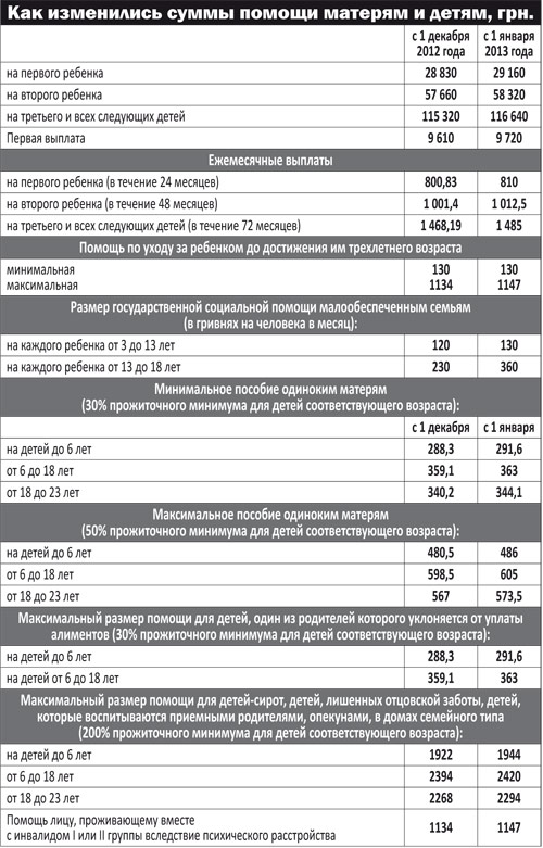 Помощь в связи с беременностью и родами составляет 25% от прожиточного минимума для трудоспособных лиц в месяц. Таким образом, с 1-го декабря 2012 это 283,5 грн, с 1-го января 2013 - 286, 75 грн, с 1-го декабря 2013 - 304,5 грн.