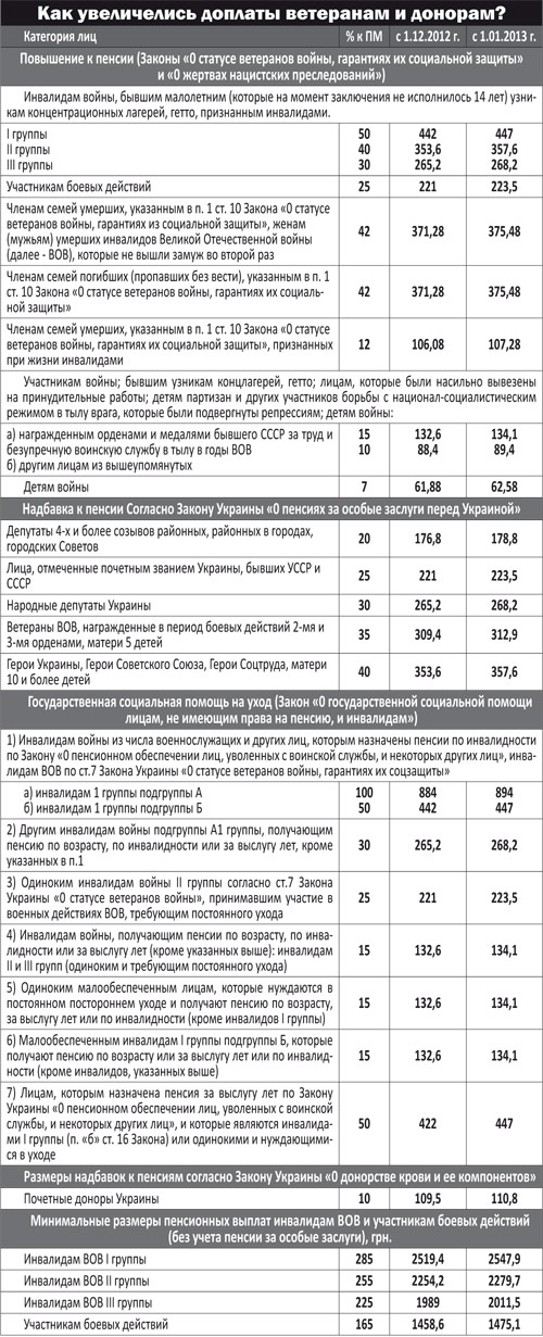 В бюджете на 2013 год предусмотрено увеличение доплат к пенсиям детей войны – они вырастут с 7% до 8% от прожиточного минимума для нетрудоспособных лиц, то есть, с 1 января 2013 – 71,52 грн.